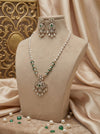 Graceful and elegant, the Pearl Kundan Necklace Set features a delicate pearl strand with a beautifully crafted kundan pendant highlighted by ruby accents. Paired with matching drop earrings, this set adds a soft, royal charm to festive and wedding looks while keeping the style light and refined.